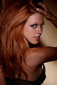 Slim ginger cutie poses in lacy black lingerie, opens shaved pussy and fills it with her fingers