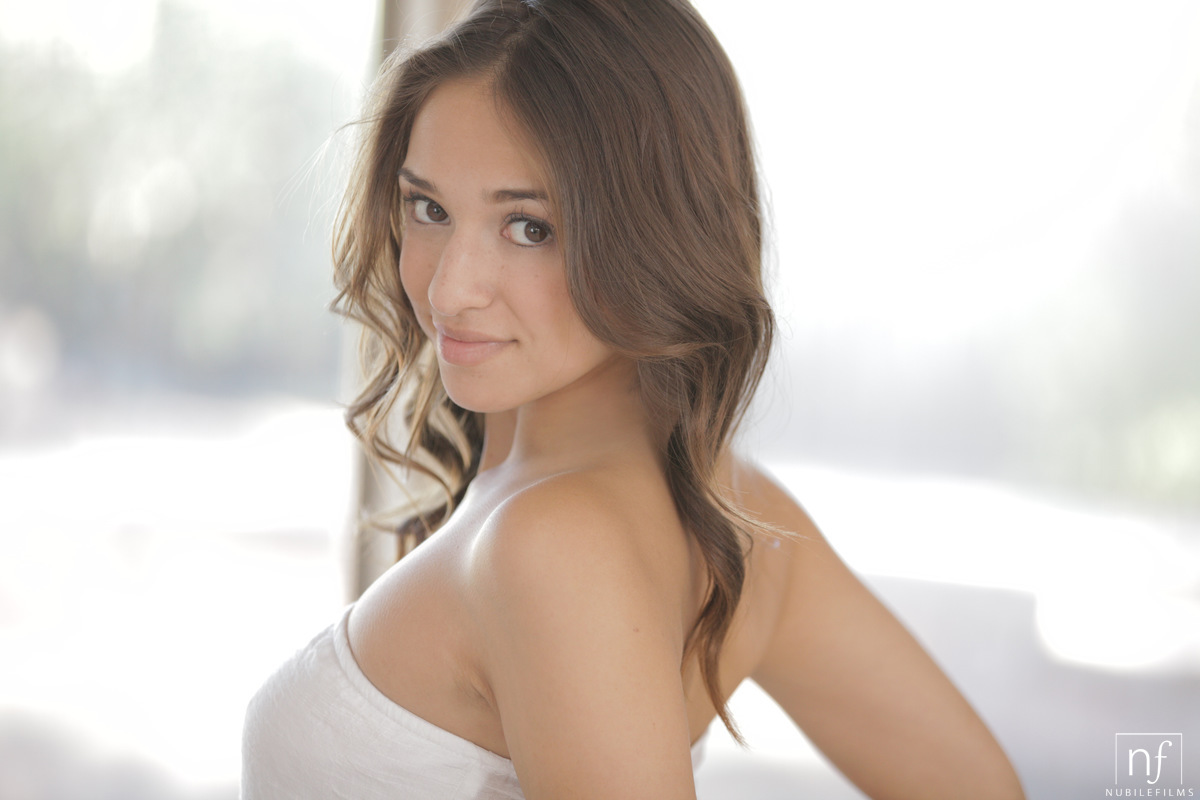 Sexy brunette wraps her hot body with white towel after shower. Sure, she takes it off when she has that chance.