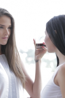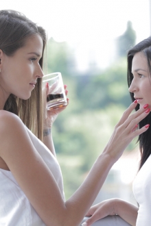 Two slim brunette babes come together for a girlish chat and a fantastic lesbian sex scene on floor.