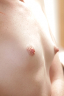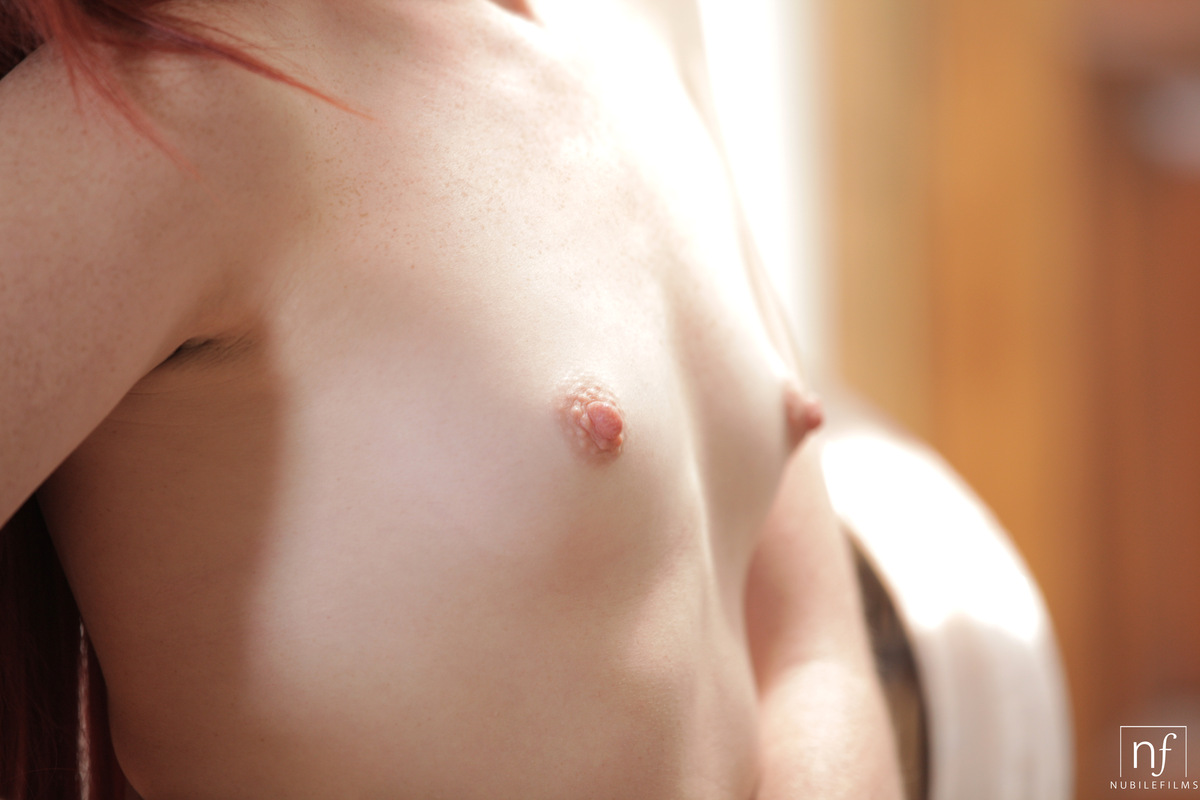 Pale redhead teen with a perfect body strips and rubs her tight pussy on the stairs.